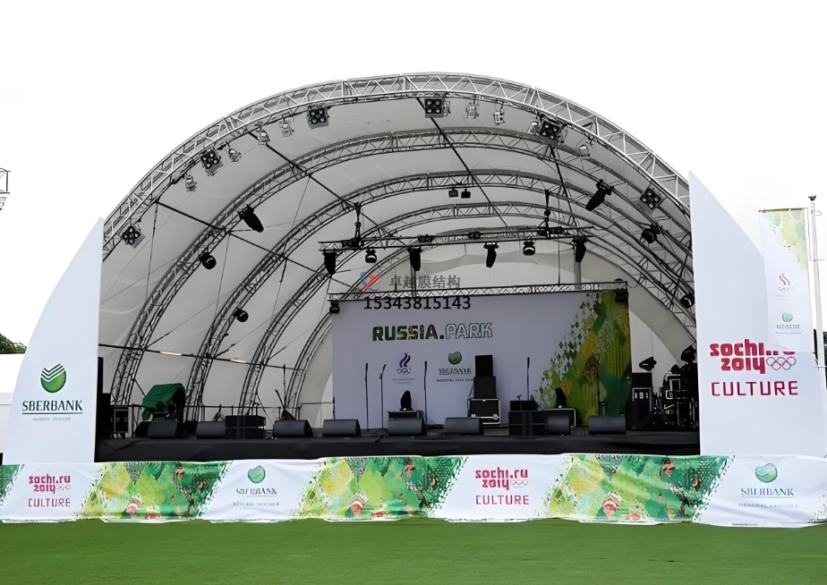 在野外展覽、商業(yè)促銷活動、主題派對等場合,舞臺膜結(jié)構(gòu)也得到了廣泛運用。它可以作為扮演舞臺、展現(xiàn)平臺或活動場所的遮陽設(shè)備。例如,在一些汽車品牌的野外展現(xiàn)活動中,膜結(jié)構(gòu)舞臺被規(guī)劃成與汽車品牌形象相符合的造型,既為新車展現(xiàn)供給了一個共同的平臺,又能招引觀眾的注意力,提高品牌宣傳作用。在野外音樂節(jié)、美食節(jié)等活動中,膜結(jié)構(gòu)舞臺為扮演樂隊、扮演團(tuán)隊供給了扮演空間,一起其共同的造型也成為活動現(xiàn)場的一道亮麗風(fēng)景線,增加了活動的招引力和趣味性。