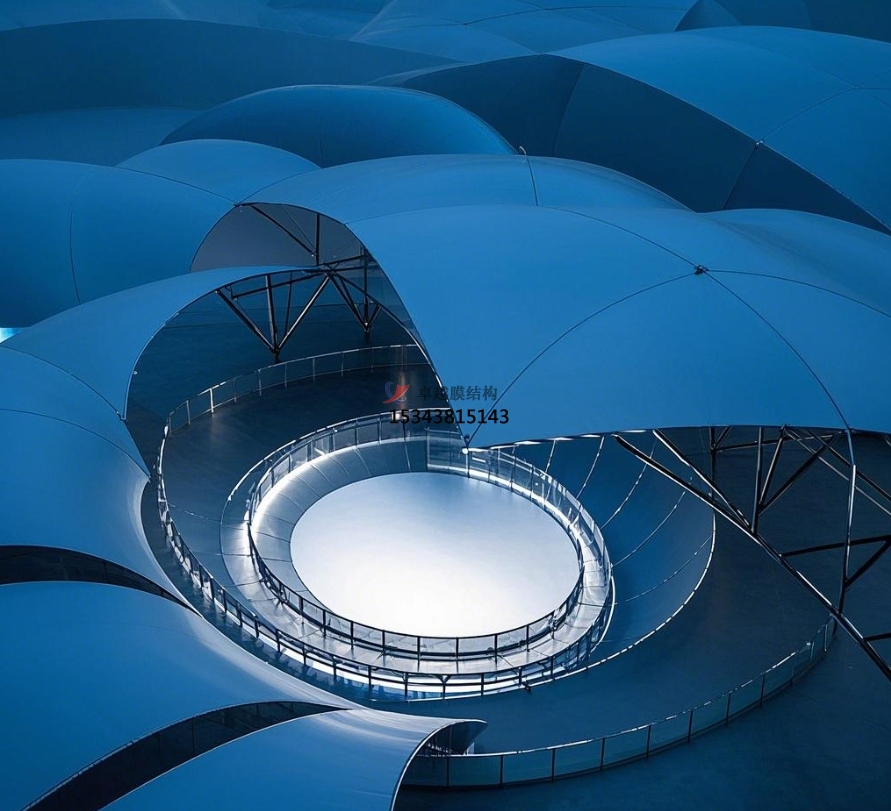形狀多樣性:膜結(jié)構(gòu)憑借其柔性資料的特性,可以完成自由空間曲面的規(guī)劃,造型豐厚多樣。從簡練流通的單曲面到復(fù)雜多變的多曲面,從高雅的弧形到賦有張力的異形,膜結(jié)構(gòu)舞臺可以依據(jù)扮演主題、場所環(huán)境以及規(guī)劃師的創(chuàng)意,塑造出千變?nèi)f化的形狀。如在一場以 “天然之舞” 為主題的舞蹈扮演中,舞臺膜結(jié)構(gòu)規(guī)劃成了一片隨風(fēng)飄動的樹葉形狀,膜材的輕柔質(zhì)感與樹葉的靈動形狀完美結(jié)合,為舞蹈藝人們打造了一個充溢天然氣味的扮演空間,讓觀眾似乎置身于森林之中,增強(qiáng)了扮演的沉溺感與藝術(shù)感染力。