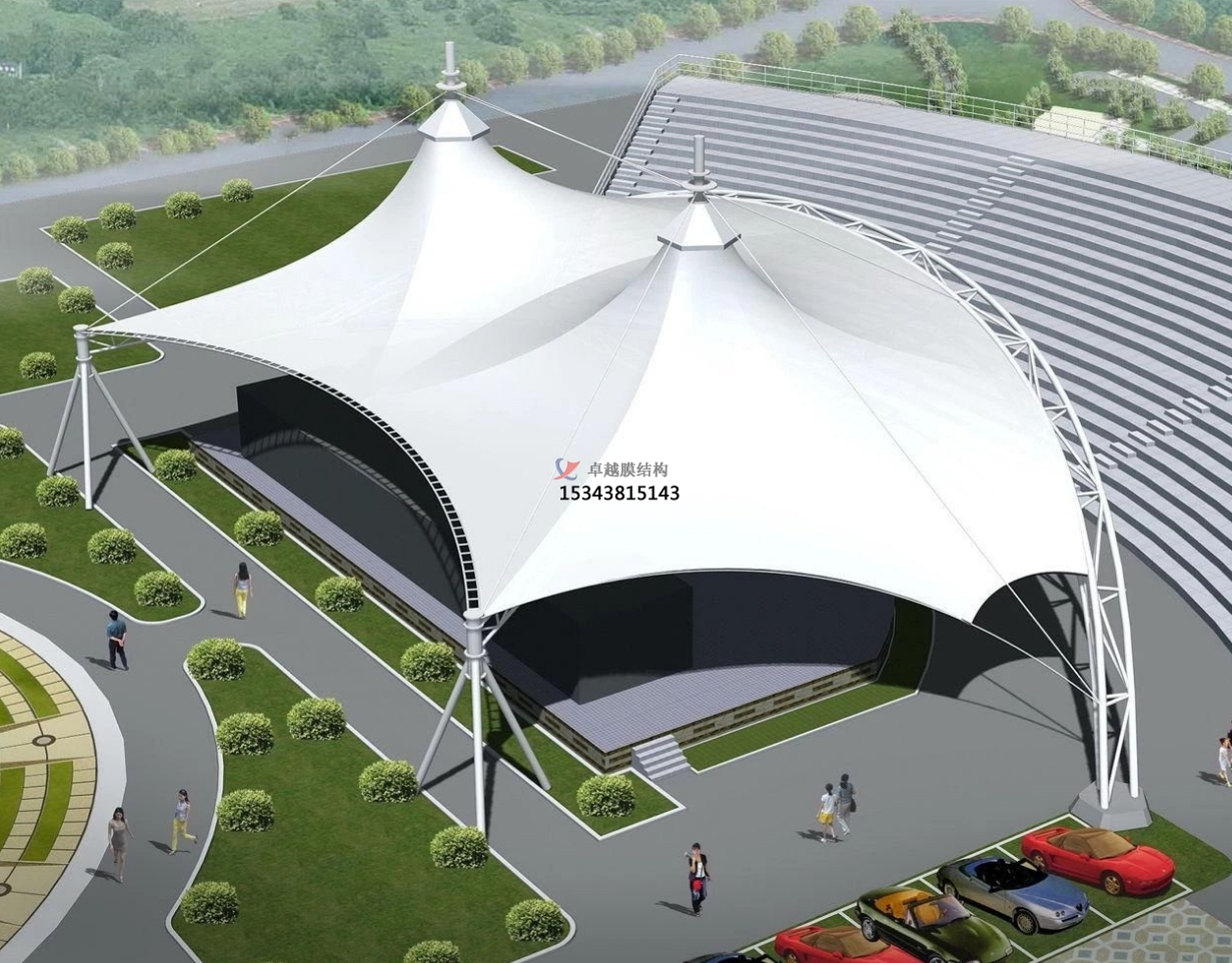 遮陽與避雨:對于野外舞臺而言,遮陽和避雨是非常重要的功能需求。膜結(jié)構(gòu)舞臺可以有用地阻撓陽光直射和雨水侵襲,為藝人和觀眾供給一個舒適的環(huán)境。在酷熱的夏日,膜材可以阻撓部分紫外線,下降舞臺區(qū)域的溫度,避免藝人因高溫中暑,一起也讓觀眾在觀看扮演時愈加舒適。在雨天,膜結(jié)構(gòu)可以避免雨水落在舞臺上,確保扮演設(shè)備不受損壞,藝人的扮演不受影響。