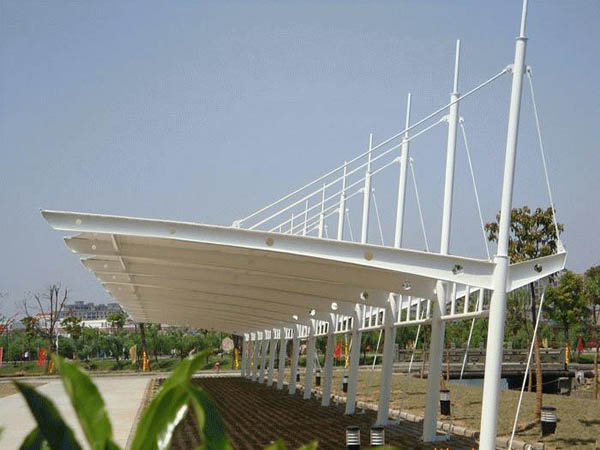 膜結(jié)構(gòu)停車棚后面是硬邊,前面挑起,使用拉索拉起固定,前后有落差,方便排水.另外有一種雙挑的也可歸類到平頂式里面.