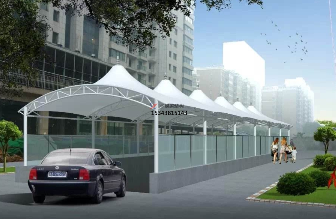 車庫出入口膜結(jié)構(gòu)頂棚廣泛應(yīng)用于住宅區(qū)、商業(yè)區(qū)、公共停車場(chǎng)等場(chǎng)所,用于車庫出入口的遮陽和防護(hù),提升車輛和行人的安全性和舒適度。