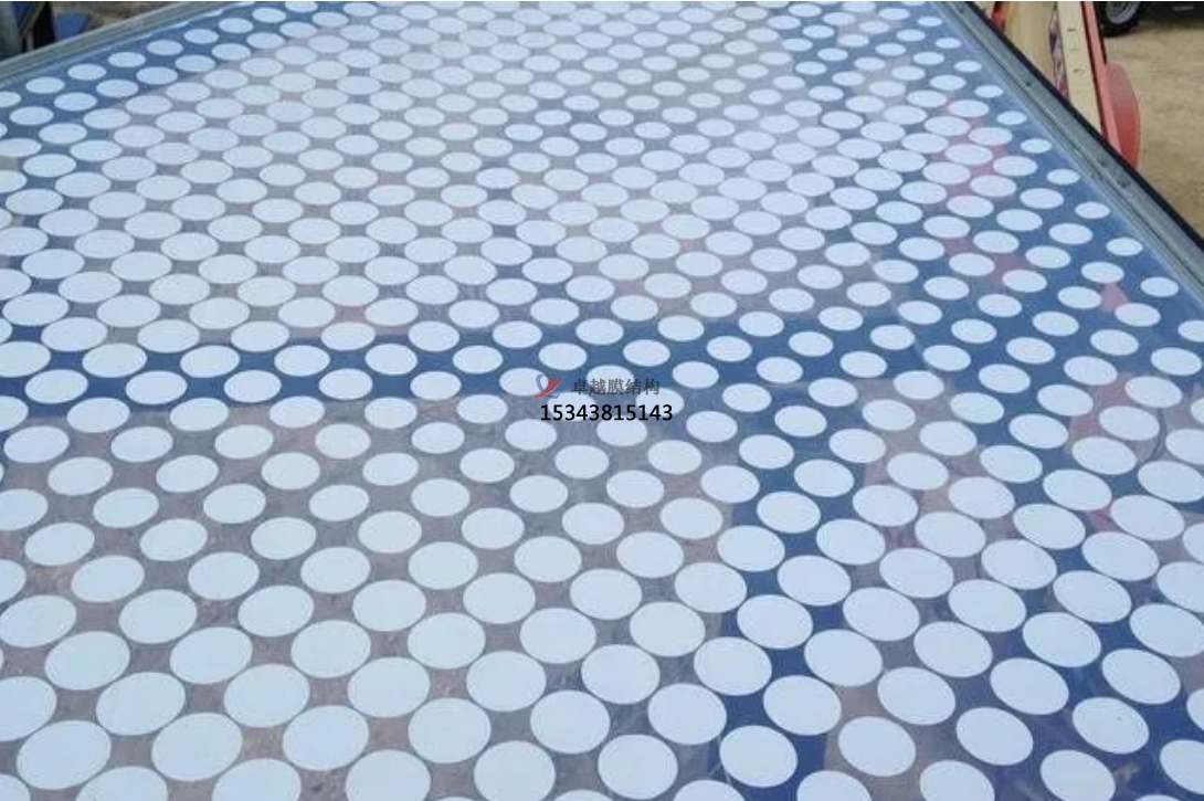 ETFE薄膜不僅具有優(yōu)良的抗沖擊性能,熱穩(wěn)定性能及耐候性,自清潔性,耐化學(xué)腐蝕性能,且重量只有同等面積玻璃的1%。 印刷ETFE膜材最常用的圖案是圓形銀點,由于銀對太陽輻射的反射,印刷面積的百分比根據(jù)太陽熱增益因子的要求進行評估。