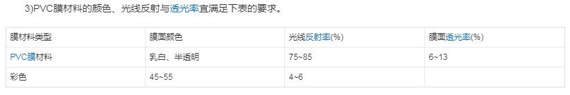 1)PVC膜材料的面層,在保質(zhì)期內(nèi)應(yīng)具有穩(wěn)定的抗腐蝕、抗紫外線侵蝕的能力,表面具有自結(jié)性能。