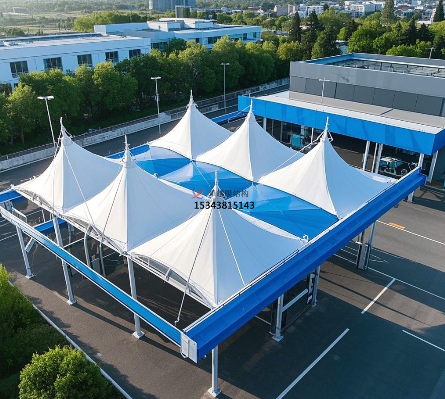 后期維護成本:膜結(jié)構(gòu)雨棚維護成本極低。膜材自潔性能使雨棚表面不易積垢,一般每年僅需 1 - 2 次簡單清潔檢查即可保持外觀整潔。同時,膜材與支撐結(jié)構(gòu)耐久性好,正常使用下很少損壞,降低維修成本。反觀傳統(tǒng)結(jié)構(gòu)雨棚,需定期進行油漆保養(yǎng)、結(jié)構(gòu)檢測等維護工作,成本較高。例如,某傳統(tǒng)鋼結(jié)構(gòu)加氣站雨棚每年維護費用高達數(shù)萬元,而采用膜結(jié)構(gòu)的同類型雨棚,年維護成本僅幾千元。