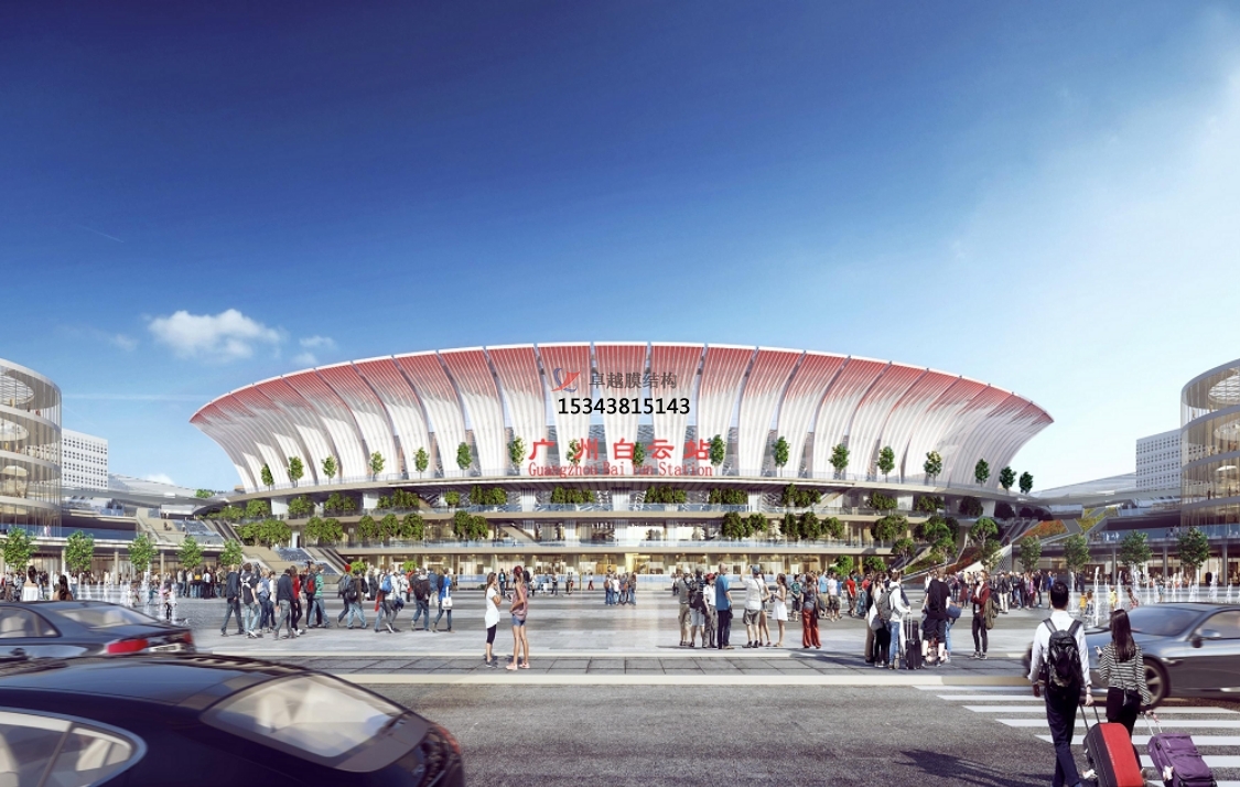 廣州白云站彩色PTFE膜結(jié)構(gòu)項目,單個膜花瓣單元采用白色和彩色膜材拼接技術(shù)。結(jié)構(gòu)上采用上下起伏的花蕾構(gòu)造,這使得膜材在張拉過程中,需要充分考慮摩擦對本項目預(yù)張力施加的困難。同時因為單個裁剪單元細長,寬度最寬約1.2m,長度大37m,其沿線長度方向整體需要焊接,所以焊接的應(yīng)力對本項目的影響尤為明顯。針對以上難點,膜材進場后,采用最先進的雙軸拉伸設(shè)備對本項目的膜材進行詳細的應(yīng)力與應(yīng)變關(guān)系的測試實驗,確保每一批次,每一張膜材在后期焊接接張拉過程中受力均勻,形態(tài)完美。