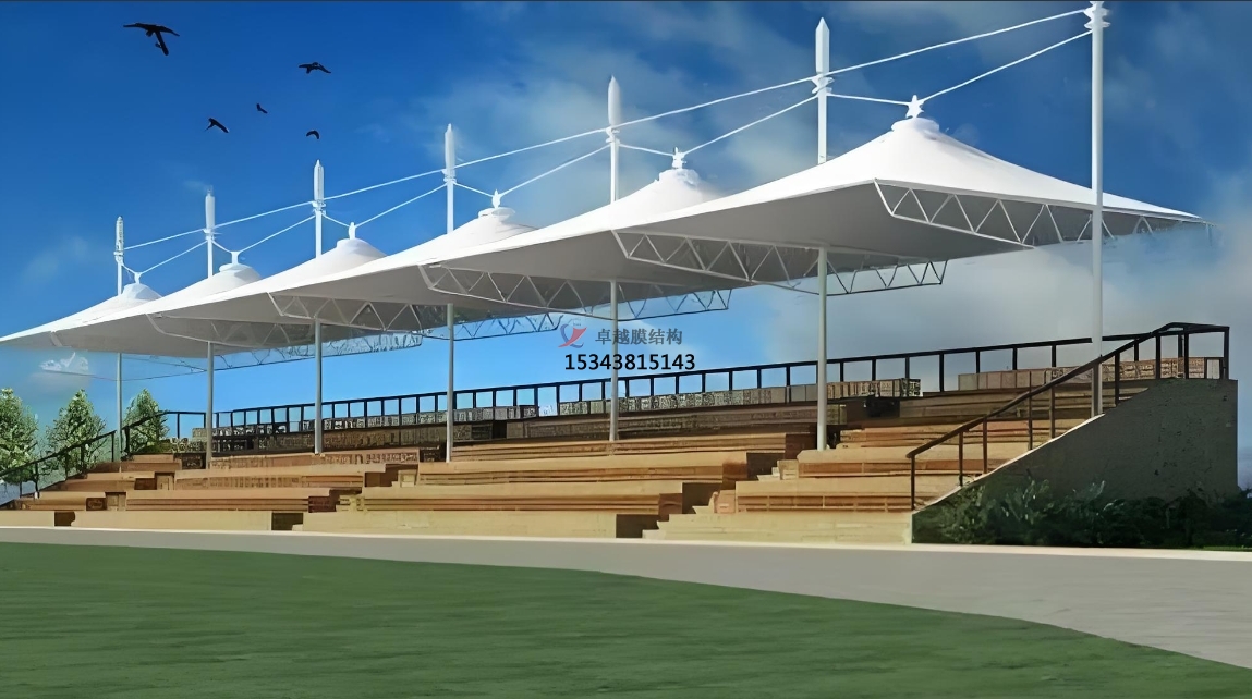 造型獨(dú)特:膜結(jié)構(gòu)體育看臺(tái)的帽頂設(shè)計(jì)風(fēng)格獨(dú)特,能夠吸引人們的目光,增強(qiáng)整個(gè)結(jié)構(gòu)的視覺效果。