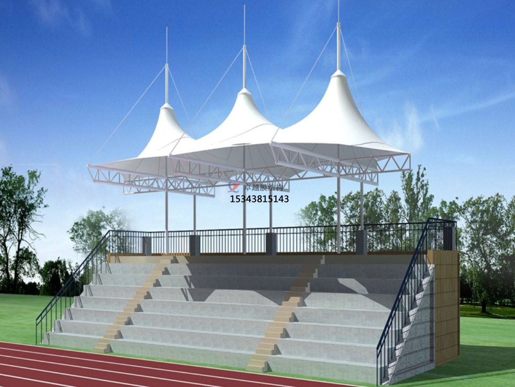膜結(jié)構(gòu)看臺(tái)廣泛用于大型體育館以及體育看臺(tái)的工程之中。作為一種大跨結(jié)構(gòu),自輕重通過(guò)膜所具鋼結(jié)構(gòu)的拉力平衡,可實(shí)現(xiàn)超越距離懸挑。采用膜結(jié)構(gòu)頂棚,符合了體育場(chǎng)館的視野寬闊、無(wú)結(jié)構(gòu)遮擋的建筑要求,成為業(yè)主以及設(shè)計(jì)師首選結(jié)構(gòu)形式。在膜結(jié)構(gòu)體育看臺(tái)的類型中,經(jīng)常會(huì)見到一種帽頂式的膜結(jié)構(gòu)體育看臺(tái),這種膜結(jié)構(gòu)體育看臺(tái)帽頂?shù)脑煨陀惺裁刺攸c(diǎn)呢?膜結(jié)構(gòu)體育看臺(tái)帽頂施工時(shí)怎么安裝呢?