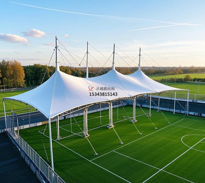 足球場膜結構主要由膜材與支撐結構攜手構建。膜材堪稱核心角色,常用的如聚四氟乙烯(PTFE)膜材,不僅具備超強的耐候性,可從容應對風吹日曬、雨雪侵襲,長期使用也不易老化損壞;其自潔性能更是出色,表面不易沾染灰塵污垢,能始終保持潔凈外觀。乙烯 - 四氟乙烯共聚物(ETFE)膜材同樣表現(xiàn)不凡,擁有良好的透光性,可讓充足的自然光灑入足球場,營造明亮舒適的運動環(huán)境,同時具備較高的強度與柔韌性 。