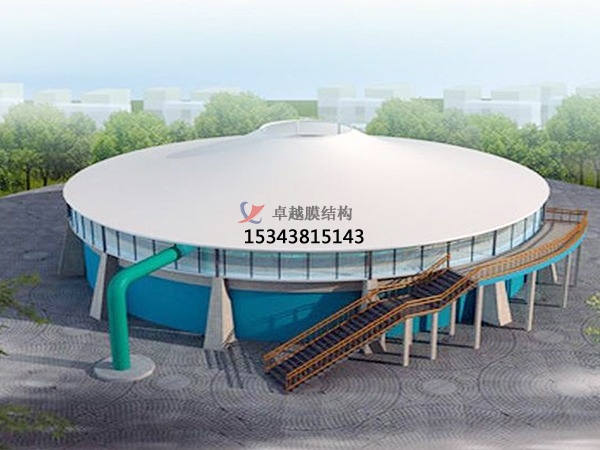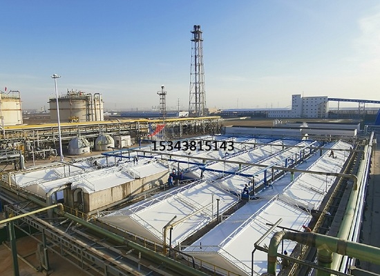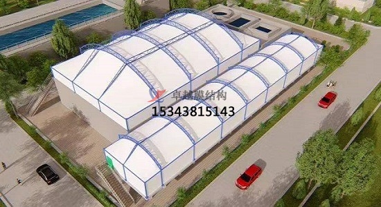 污水池加蓋的原理:密封收集,膜材完全覆蓋污水池,四周與池壁密封,防止廢氣外溢。廢氣輸送,罩體表面設(shè)出氣口,通過(guò)管道將廢氣輸送至凈化設(shè)備(如噴淋塔)。凈化處理,酸性廢氣采用堿液噴淋吸收,堿性廢氣采用酸液噴淋。處理效率可達(dá)90%以上,確保達(dá)標(biāo)排放。防腐設(shè)計(jì),鋼構(gòu)不與池內(nèi)氣體接觸,膜材采用耐腐蝕的氟碳纖維材質(zhì),雙重防護(hù)提升耐久性。