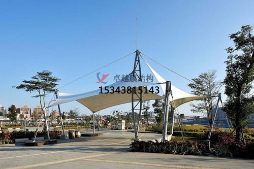 張拉膜景觀遮陽棚具有較好的隔熱效果,對太陽熱能可反射掉70%,膜材本身吸收了17%,傳熱13%,而透光率卻在20%以上,經(jīng)過10年的太陽光直接照射,其輝度仍能保留70%.這與它本身的材質(zhì)有關(guān)系。
