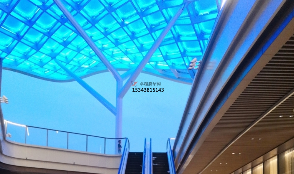 膜結(jié)構(gòu)以高強度柔性薄膜(如ETFE、PVDF)為核心材料,結(jié)合鋼索、桁架等支撐體系,形成兼具輕量化與高穩(wěn)定性的空間曲面12。其自重僅為傳統(tǒng)鋼構(gòu)的1/3,大幅降低基礎造價,同時支持50米以上無柱大跨度設計,為商業(yè)廣場創(chuàng)造開闊通透的公共空間。ETFE氣枕膜通過多層鍍點設計,可智能調(diào)節(jié)透光率與紫外線過濾效率,例如嘉興長安里商業(yè)街的天幕結(jié)構(gòu),既能實現(xiàn)光線漫射營造柔和氛圍,又能有效阻隔70%以上的紫外線輻射。