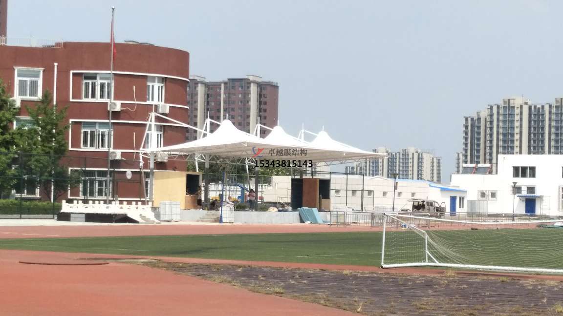 膜結(jié)構(gòu)看臺的排水措施。因為用于膜結(jié)構(gòu)中的膜材料本身具有很強的拉伸性能,并且該拉伸性能由于大重力的擠壓作用而容易導(dǎo)致膜結(jié)構(gòu)變形。遇到雨雪天氣時,這種變形會導(dǎo)致雨水積聚在凹槽中,無法及時排出。它不僅會損壞膜材料,還會導(dǎo)致膜結(jié)構(gòu)被雨水腐蝕,從而嚴(yán)重影響停車棚的質(zhì)量。因此,在施工過程中必須采取排水措施。