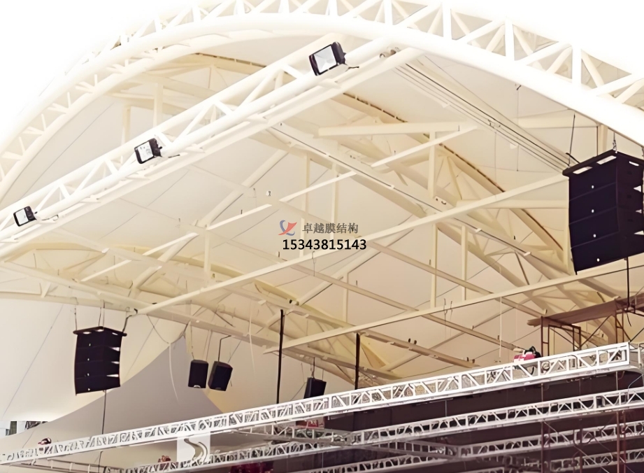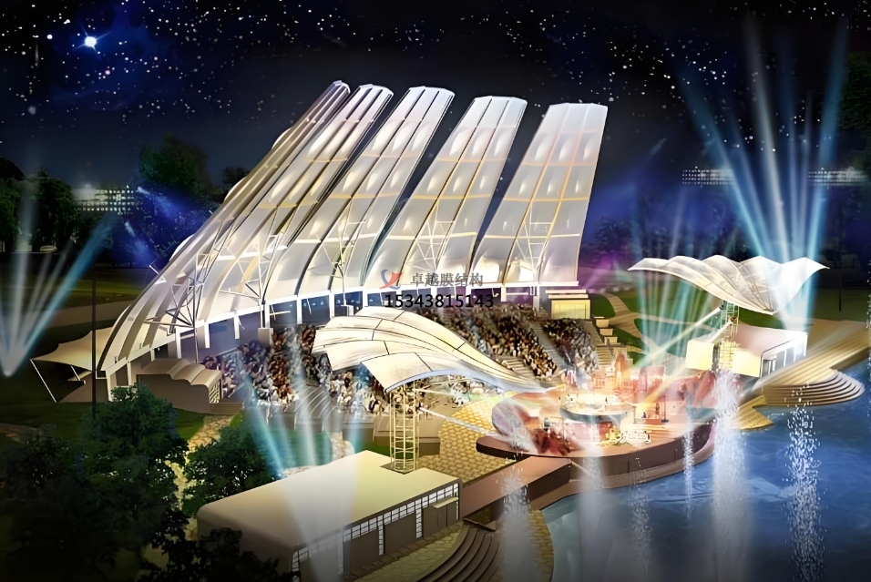 舞臺膜結構,簡而言之,是采用高強度柔性薄膜材料(如PVDF、ETFE等)作為覆蓋物,通過鋼結構或索膜結構體系支撐,形成具有特定形態(tài)和功能的舞臺空間結構。這種結構不僅外觀新穎獨特,能夠根據設計需求自由變換形態(tài),還具備良好的透光性、自潔性和耐候性,為舞臺表演提供了無限可能。