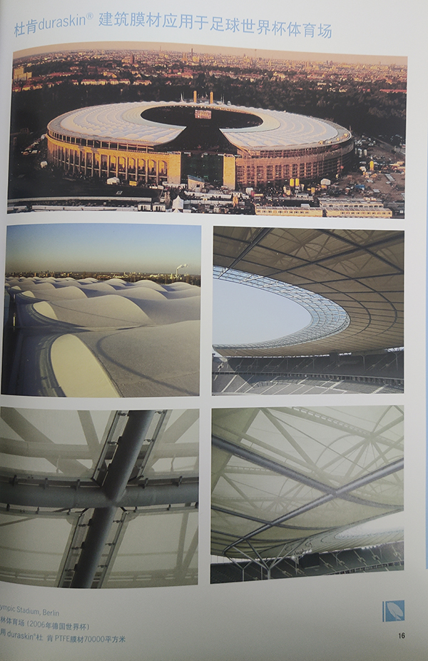 3、有眾多的成功案例:在歐洲的大型PVC項(xiàng)目幾乎都采用杜肯膜材:1993年斯圖加特體育場(chǎng)34000平方米;1994年德國(guó)Halle網(wǎng)球中心10000平方米;1995年奧地利機(jī)場(chǎng)停車場(chǎng)16000平方米;1996年土耳其安卡拉體育場(chǎng)16000平方米;德國(guó)科隆音樂(lè)中心25000平方米;1997年德國(guó)漢堡網(wǎng)球中心10000平方米;1998年法國(guó)圖盧茲體育場(chǎng)15000平方米;999年德國(guó)漢堡體育場(chǎng)50000平方米;2000年CARGOLIFTER車間110000平方米;2001年美國(guó)奧蘭多Dolphin賓館15000平方米等等。