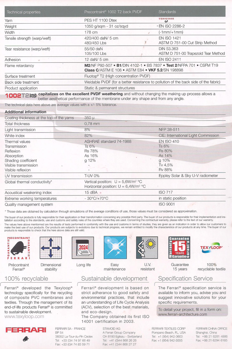法拉利膜材十多年來,法拉利(PVDF)表面處理的復(fù)合膜材被應(yīng)用在全世界重要的織物建筑工程中。現(xiàn)在,第代膜材再次確認(rèn)了這一出眾材料性能的更新發(fā)展。法拉利研發(fā)了第代材料正是為了滿足建筑師和業(yè)主在新世紀(jì)之初對于織物建筑提出的要求。這一 全新的膜材得益于更新的科研技術(shù),即將PVDF和硬化介體完美地結(jié)合。這種特殊的結(jié)合明顯地提高了材料的機(jī)械強(qiáng)度、使用壽命,并能長期保持織物建筑的原始 美觀。第代膜材在積累了10多年的經(jīng)驗(yàn)的基礎(chǔ)上,可以提供專業(yè)保證。法拉利現(xiàn)在能夠根據(jù)要求和每個(gè)項(xiàng)目的具體情況,提供12年質(zhì)量保證 (PRECONTRAINT702除外)。