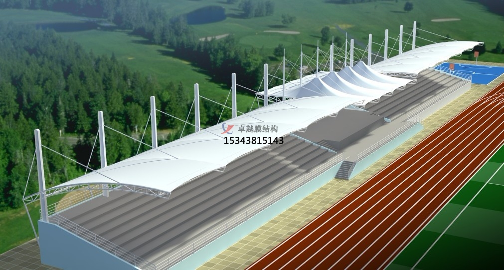 張拉膜看臺(tái)主要用于各類地方體育場(chǎng)主席臺(tái)雨棚,各類學(xué)校體育場(chǎng)看臺(tái)雨棚遮蓋,我公司是國(guó)內(nèi)較早從事大懸挑張拉膜結(jié)構(gòu)看臺(tái)設(shè)計(jì)施工的專業(yè)廠家,下面介紹一下我們?cè)谔兄苓吙h市完工的一些張拉膜看臺(tái)設(shè)計(jì)施工案例,我公司先后在太原周邊承接了太原學(xué)院張拉膜看臺(tái)雨棚、太原生態(tài)工程學(xué)校張拉膜看臺(tái)罩棚、濟(jì)源高級(jí)中學(xué)張拉膜看臺(tái)遮陽(yáng)棚等設(shè)計(jì)施工項(xiàng)目,簡(jiǎn)介如下: