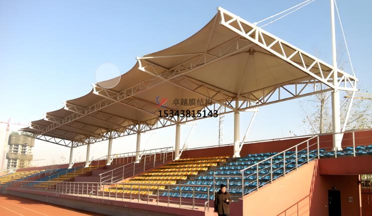 看臺張拉膜的功能:遮陽擋雨,環(huán)保節(jié)能,安全可靠,靈活定制。看臺張拉膜為觀眾提供了寬敞舒適的坐席,膜材透光性可提供所需照度,實(shí)現(xiàn)自然采光與人工采光結(jié)合,節(jié)省照明能耗,且夜間在燈光映射下形成絢麗景觀,同時(shí)具備遮陽擋雨的功能,確保在各種天氣條件下都能提供良好的觀賽體驗(yàn)。采用可回收材料,生產(chǎn)消耗資源少,能反射陽光降低內(nèi)部溫度,減少空調(diào)使用,符合綠色建筑理念。由于其輕質(zhì)特性,看臺張拉膜對基礎(chǔ)的需求較低,減少了建筑材料的消耗,高質(zhì)量張拉膜強(qiáng)度高、抗腐蝕性能佳,能抵御紫外線、風(fēng)霜雨雪等自然因素影響,長期使用無需頻繁大規(guī)模耗資維修保養(yǎng)??磁_張拉膜結(jié)構(gòu)設(shè)計(jì)要求合理安全,首先應(yīng)用支承結(jié)構(gòu)的穩(wěn)定性,方便張拉膜面時(shí)把握控制點(diǎn)空間位置及實(shí)施張拉,膜材撕裂時(shí)不至于結(jié)構(gòu)整體倒塌,更換膜面施工方便。然后利用水平力的傳遞,采用合適構(gòu)造措施確保作用于膜面的荷載以膜面張力形式通過邊界索經(jīng)膜角節(jié)點(diǎn)板傳遞到支承結(jié)構(gòu)或基礎(chǔ)時(shí),水平力可靠傳遞。其次利用結(jié)構(gòu)體系內(nèi)力的自平衡,將支承結(jié)構(gòu)體系設(shè)計(jì)成自平衡體系,減少膜面張力對下部結(jié)構(gòu)或地基的影響。最后根據(jù)結(jié)構(gòu)單元的重復(fù)與組合,利用基本外形的機(jī)構(gòu)單元組合形成大面積覆蓋空間時(shí),注意膜面的熱合線在連接處要對齊,形成連續(xù)、流暢視覺效果。膜材料和支撐構(gòu)件經(jīng)嚴(yán)格檢測認(rèn)證,設(shè)計(jì)施工考慮防火、防腐蝕等安全因素,結(jié)構(gòu)穩(wěn)定性好,發(fā)生意外坍塌危險(xiǎn)性小??磁_張拉膜可以根據(jù)具體需求進(jìn)行量身定制,適應(yīng)各種形狀和尺寸,完美契合不同場合。