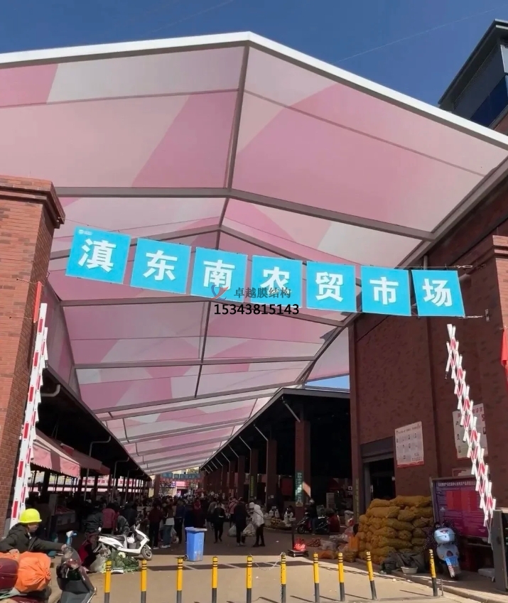 膜材差異:不同膜材價格懸殊。PVC 膜材價格相對較低,每平方米在 200 - 500 元不等,適合預(yù)算有限、對性能要求相對不高的小型農(nóng)貿(mào)市場;PTFE 膜材價格高昂,每平方米可達(dá) 1000 - 3000 元,常用于追求高品質(zhì)、長壽命的大型或重要農(nóng)貿(mào)市場項目。