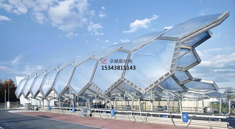 以下是膜結(jié)構(gòu)產(chǎn)品的主要應用和特點:膜結(jié)構(gòu)自行車棚和機動車棚,膜結(jié)構(gòu)景觀,膜結(jié)構(gòu)污水池加蓋,膜結(jié)構(gòu)體育場館和展會建筑,膜結(jié)構(gòu)藝術(shù)裝置,膜結(jié)構(gòu)充電樁和收費站。膜結(jié)構(gòu)自行車棚采用輕質(zhì)且堅固的膜材料,具備優(yōu)異的抗風、抗雨雪能力,同時具有自潔性,減少維護成本。其優(yōu)雅的造型和多樣的色彩選擇,使其成為城市中的一道靚麗風景線,而機動車棚的篷布采用PVC、PVDF、PTFE、ETFE等材料,具有高強度、耐久性好、防火難燃、自潔性強等特點。其透光率為13%,熱能反射率為73%,能有效減少熱吸收,使用壽命可達15-30年4。膜結(jié)構(gòu)景觀是一種耐用、高強度的涂層織物,具有柔韌的質(zhì)地、重量輕、透光性極佳等特點,常被用于公園、廣場等場所,成為吸引眼球的藝術(shù)景觀。隨著工業(yè)污染的加劇,膜結(jié)構(gòu)污水池加蓋因其環(huán)保、施工簡便等優(yōu)勢,逐漸成為工業(yè)污水處理的首選。其鋼材料使用量少,能有效解決池體跨度過大的施工難題。膜結(jié)構(gòu)在體育場館和展會建筑中的應用,不僅縮短了建設工期,降低了造價成本,還減少了環(huán)境污染。其大跨度的設計和高透光性,為場館提供了良好的采光和空間感。膜結(jié)構(gòu)藝術(shù)裝置設計簡單、造型獨特,不僅具有藝術(shù)展示效果,還能為人們提供休息場所,廣泛應用于公園、景區(qū)等場所。膜結(jié)構(gòu)充電樁和收費站以其耐用性和美觀性,成為現(xiàn)代城市基礎(chǔ)設施的重要組成部分,為人們提供便捷服務的同時,也大大提升了城市形象。
