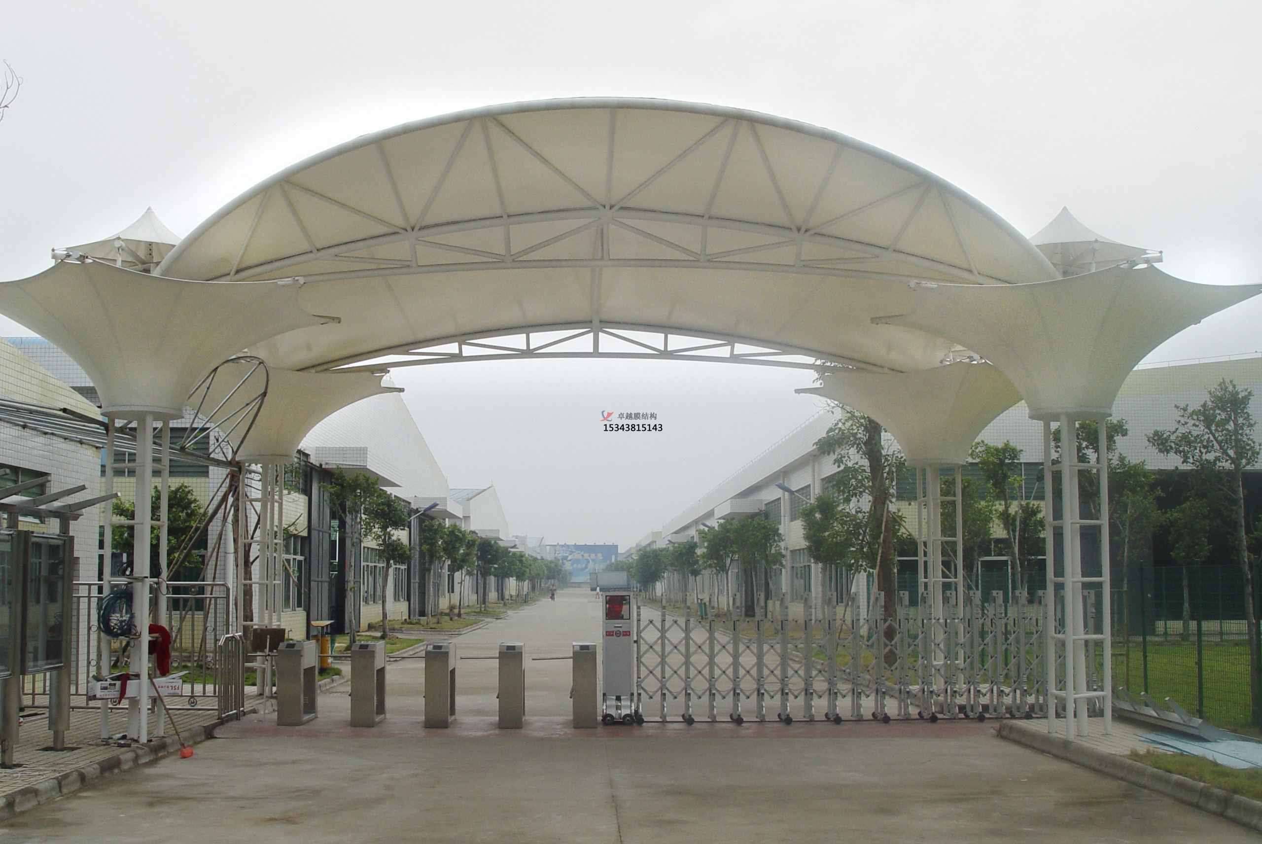 大門膜結(jié)構(gòu)的出入口主要為大門提供遮陽和防雨功能,增加大門造型的觀賞性和藝術(shù)性。其優(yōu)點如下: