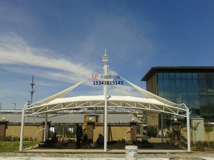 6、景觀設(shè)施:膜結(jié)構(gòu)以其特殊的建筑表現(xiàn)手法,主要體現(xiàn)在造型、漫射透光性、豐富多彩,可廣泛應(yīng)用于入口、標志性小品 、步行街、停車場等,其他建筑特性無須較高要求。