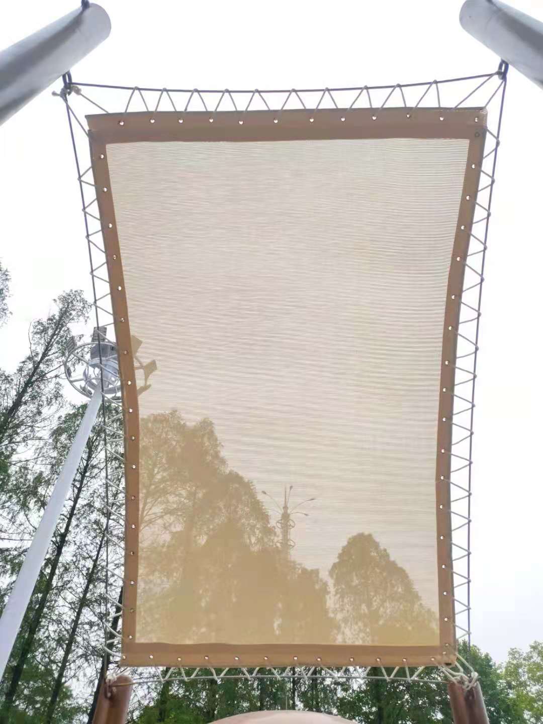 武漢瑪雅公園膜結(jié)構(gòu)景觀,是我公司與游樂設(shè)備公司配套工程,材料遮陽效果好,質(zhì)量輕,采用法國進(jìn)口彩色法拉利網(wǎng)格膜材,空運(yùn)到我廠深加工后,現(xiàn)場(chǎng)安裝完成的,完工時(shí)間2021年4月7日