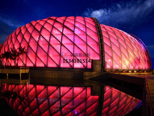 膜結構是20世紀中期發(fā)展起來的一種新型建筑結構類型,它打破了純直線建筑風格的模式,以其獨有的優(yōu)美曲面造型,簡潔、明快、剛與柔、力與美的組合,給人耳目一新的感覺,同時給建筑設計師提供了更大的想象和創(chuàng)造空間。
