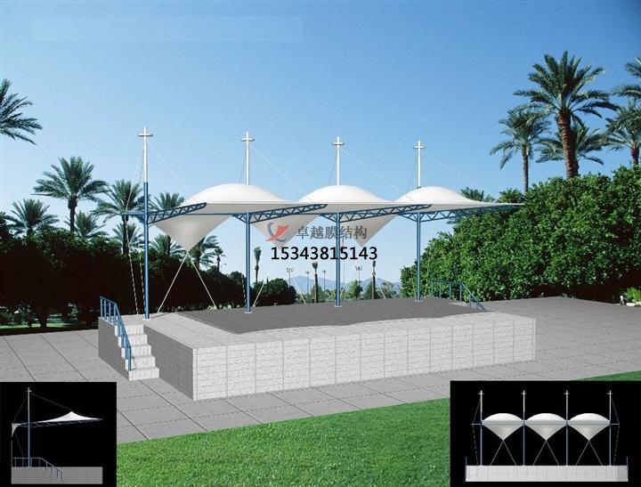 膜結構看臺的防曬效果是非常好的,這主要它所使用的膜材有關。膜結構的膜材主要有四種:PVC、PVF、PVDF和PTFE,這四種材料在具有一定的色彩效果的同時,還擁有很好的透光性與防曬性,可以濾除大部分紫外線,同時對自然光的透射率還可達百分之二十五,在經過設計后,透射光在結構內部可產生均勻的漫射光,無陰影、無眩光,具有良好的顯色性,能夠在夜晚配合環(huán)境光和照明系統(tǒng)的作用下發(fā)出自然柔和的色彩,可以說既能起到防曬效果,又能成為很好的景觀性建筑。