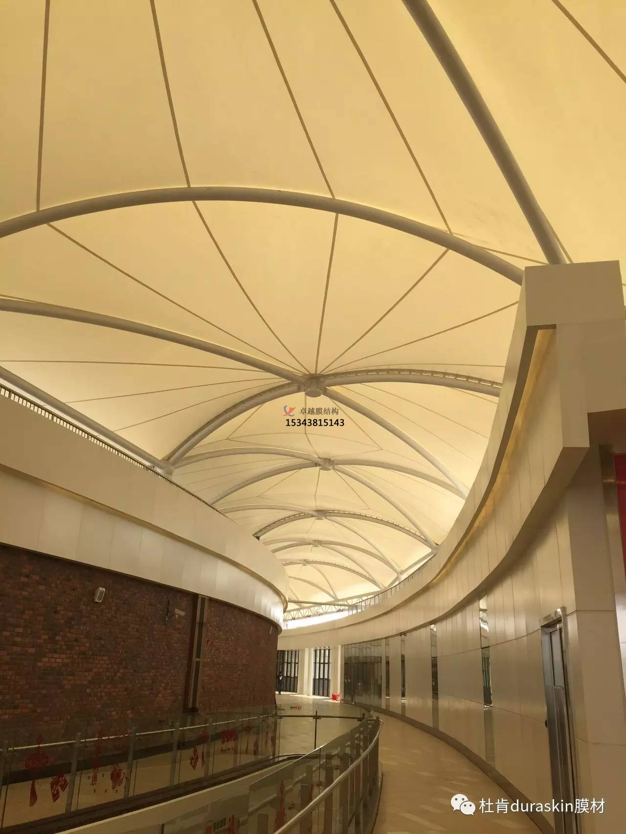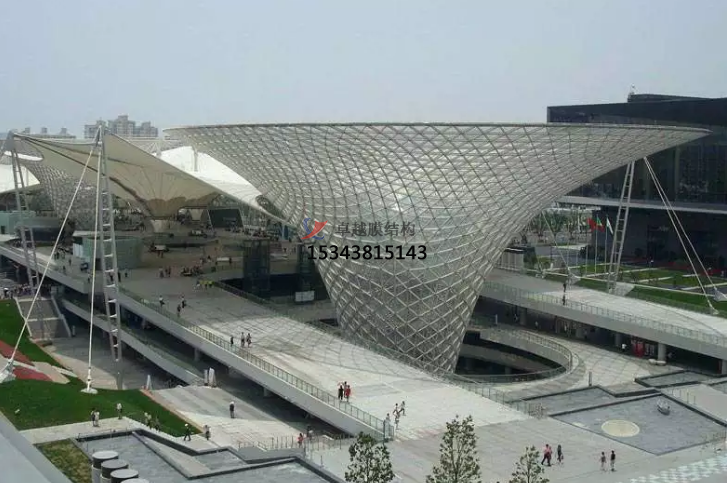 建筑入口使城市公共空間與建筑空間相鄰的界面,成為城市空間的組成部分。它是人們視覺更先接觸的部分,因此,除了功能以外,還應(yīng)有很強(qiáng)的標(biāo)識(shí)性,并能體現(xiàn)建筑的個(gè)性,是建筑環(huán)境和城市景觀的重要組成部分。由于膜結(jié)構(gòu)自然的曲線美是其他結(jié)構(gòu)類型無法比擬的,故成為近來建筑入口及屋頂經(jīng)常采用的形式。