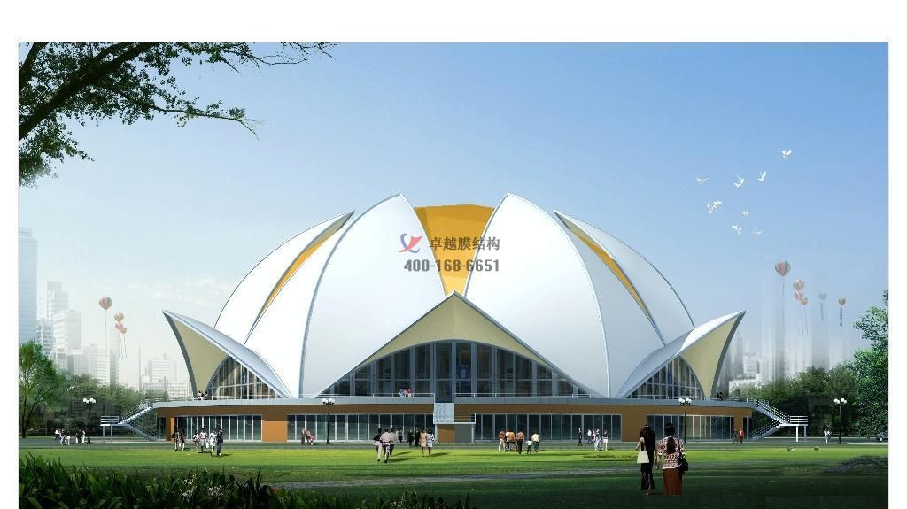 膜結(jié)構(gòu)突破了傳統(tǒng)的建筑結(jié)構(gòu)形式,具有造型優(yōu)美、飄逸自然、融藝術(shù)、力學(xué)于一體,可充分發(fā)揮建筑師的想象力,建造成各種造型,且色彩豐富,膜結(jié)構(gòu)被譽(yù)為21世紀(jì)的現(xiàn)代高科技綠色建筑。?
