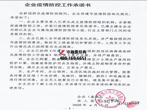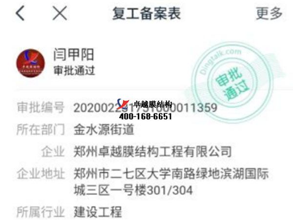 今天你復(fù)工了嗎?我們卓越膜結(jié)構(gòu)工程有限公司經(jīng)過(guò)層層審批,更終批準(zhǔn)于2020年3月2號(hào)正式復(fù)工。