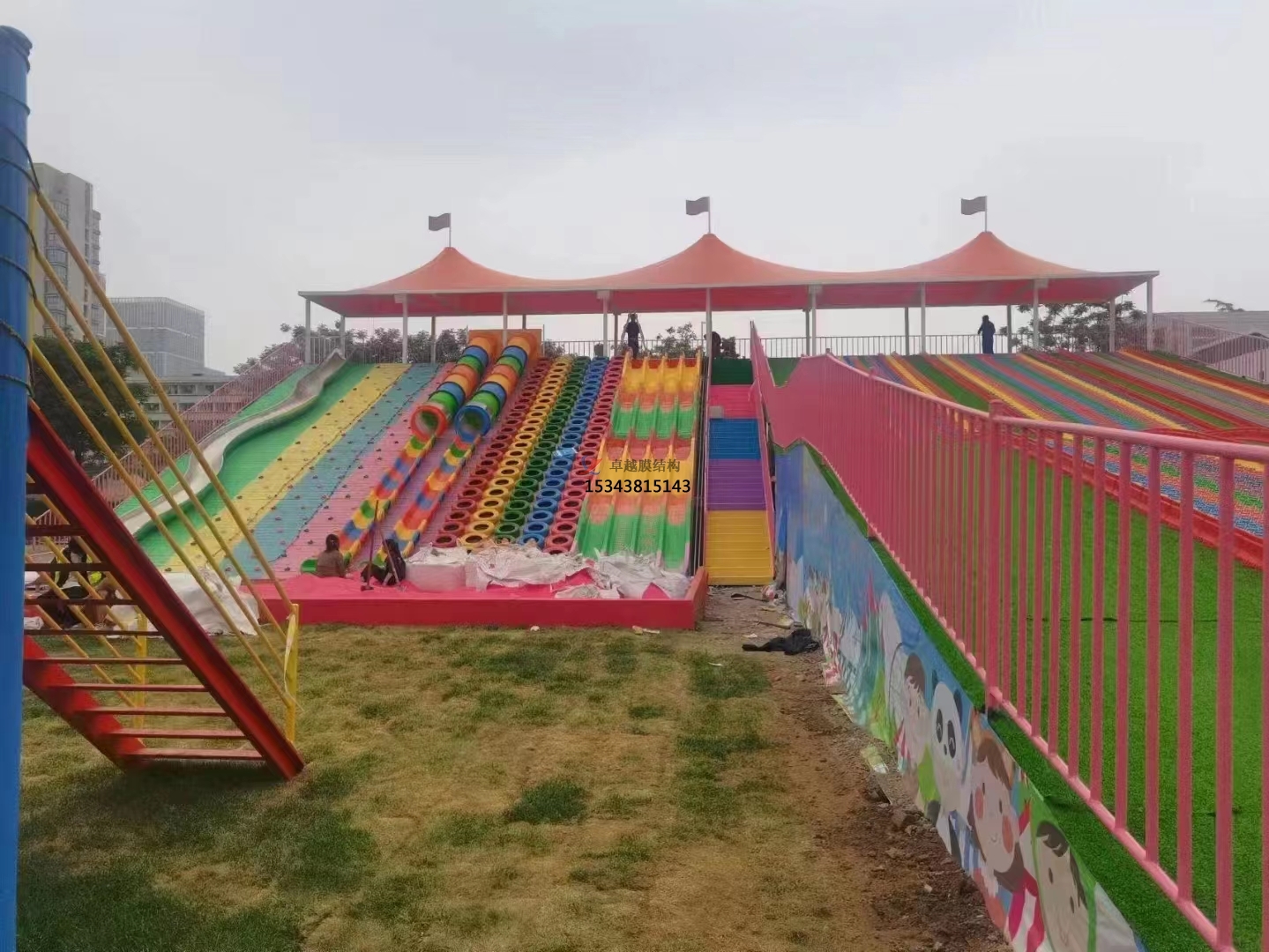 生產(chǎn)工藝:定制廠家會根據(jù)客戶提供的設(shè)計圖紙和生產(chǎn)要求,進行裁剪、拼接、硫化、印刷等工藝處理,最終生產(chǎn)出符合客戶要求的彩虹滑道新款張拉膜頂。