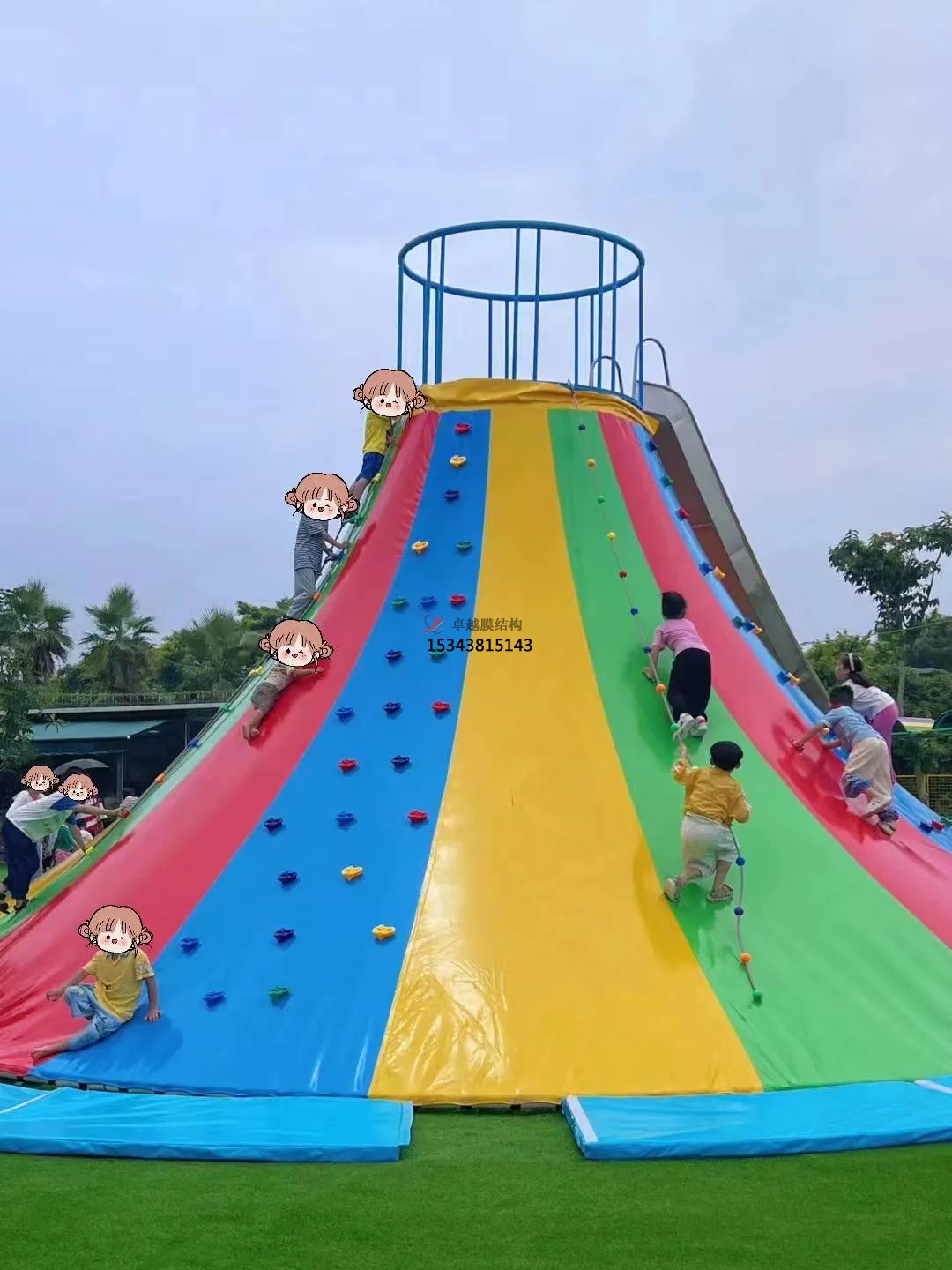 小朋友們可以從底部貼緊“火山”,雙手抓住巖石向上攀登,當(dāng)成功攀巖到山頂時(shí),可以從“火山”頂部通過滑梯或者“火山”表面滑下來。