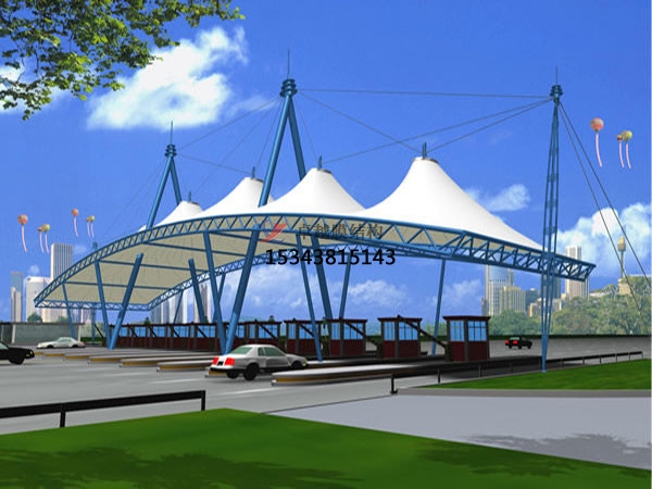 四、收費(fèi)站膜結(jié)構(gòu)罩棚在結(jié)構(gòu)的穩(wěn)定性,耐久性、抗風(fēng)性、抗雨雪性對(duì)比傳統(tǒng)的彩鋼板有著不可比擬的優(yōu)勢(shì),膜結(jié)構(gòu)本身的應(yīng)力結(jié)構(gòu)在遇到雨雪天氣膜結(jié)構(gòu)本身的結(jié)構(gòu)特性也可以保證其大跨度的抗壓穩(wěn)定性。