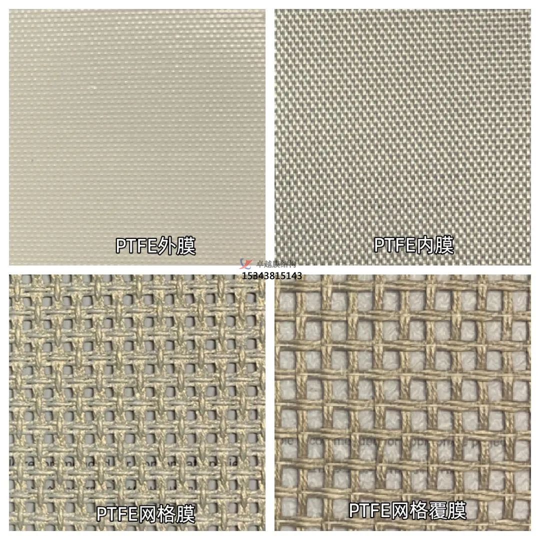 PTFE網(wǎng)格膜,基材紗線編織間距很大,涂層不再是滿覆,形成一定的開孔率(20~70%)。特點(diǎn)是透光率高(30~70%,透光透景)、裝飾遮陽效果好;強(qiáng)度低于外膜、透氣透水、不吸音。