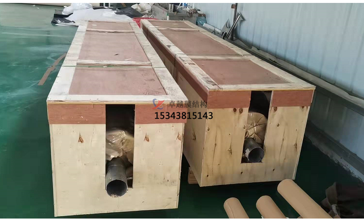 此圖為膜材整箱到貨的圖片,PTFE膜材采用鋼構(gòu)內(nèi)拖,木箱包裝。