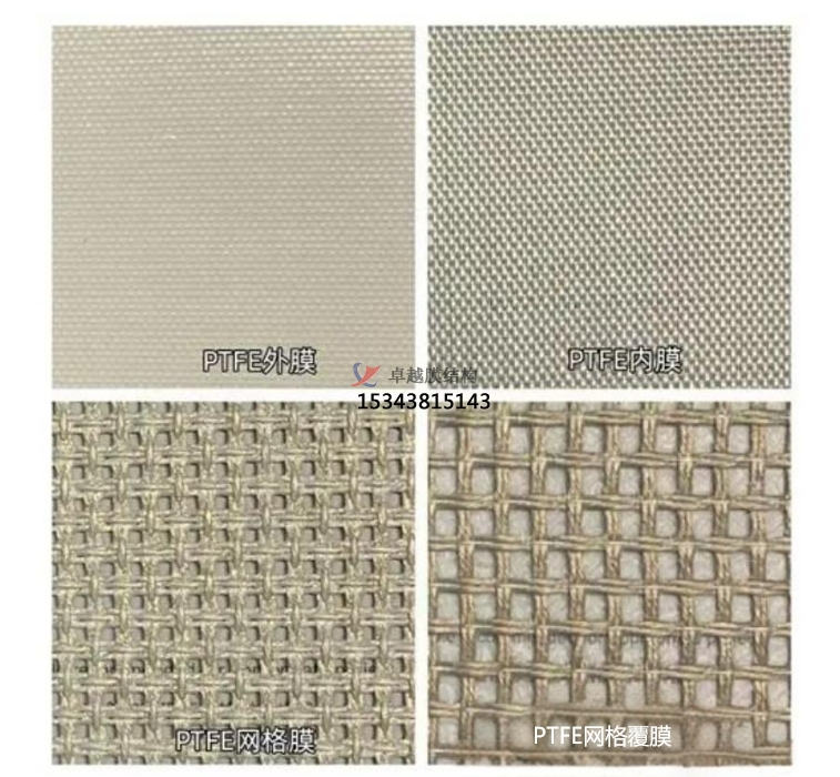 PTFE網(wǎng)格膜,基材紗線編織間距很大,涂層不再是滿覆,形成一定的開孔率(20~70%)。特點(diǎn)是透光率高(30~70%,透光透景)、裝飾遮陽效果好;強(qiáng)度低于外膜、透氣透水、不吸音。