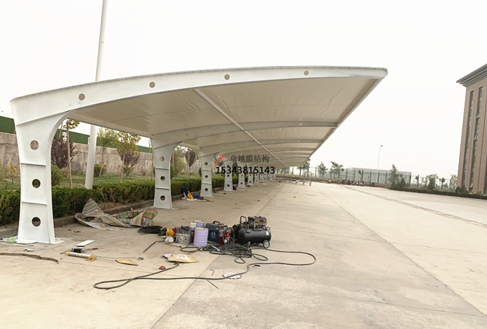 • 環(huán)保節(jié)能:膜結(jié)構(gòu)材料通??梢曰厥绽?,符合綠色建筑的理念。同時(shí),雨棚的設(shè)計(jì)使得車棚內(nèi)的照明需求較低,可以減少能耗。部分膜材料還具有高透光率和良好的熱反射性能,進(jìn)一步提高了雨棚的節(jié)能效果。