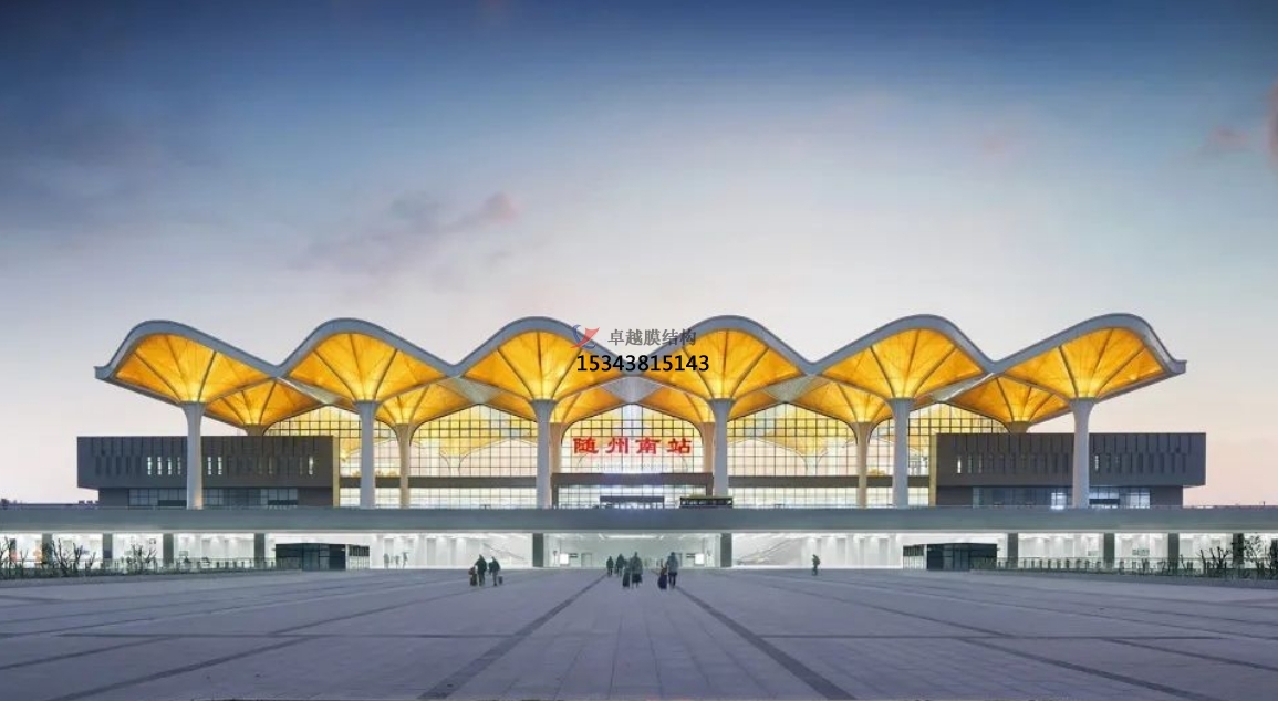 隨州高鐵站:隨州高鐵站站房采用了膜結(jié)構(gòu)設(shè)計,通過驗算不同膜材的最大適用跨度,最終選用了滿足要求的膜材方案。該站房膜結(jié)構(gòu)造型獨特,既美觀又實用,成為隨州市的新地標(biāo)。