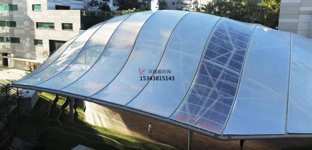 氟塑膜(ETFE)是一種新興的建筑材料,由乙烯和四氟乙烯共聚而成,是一種輕質、耐熱的薄膜,俗稱“軟玻璃”,也是目前為止最強韌的氟塑料。