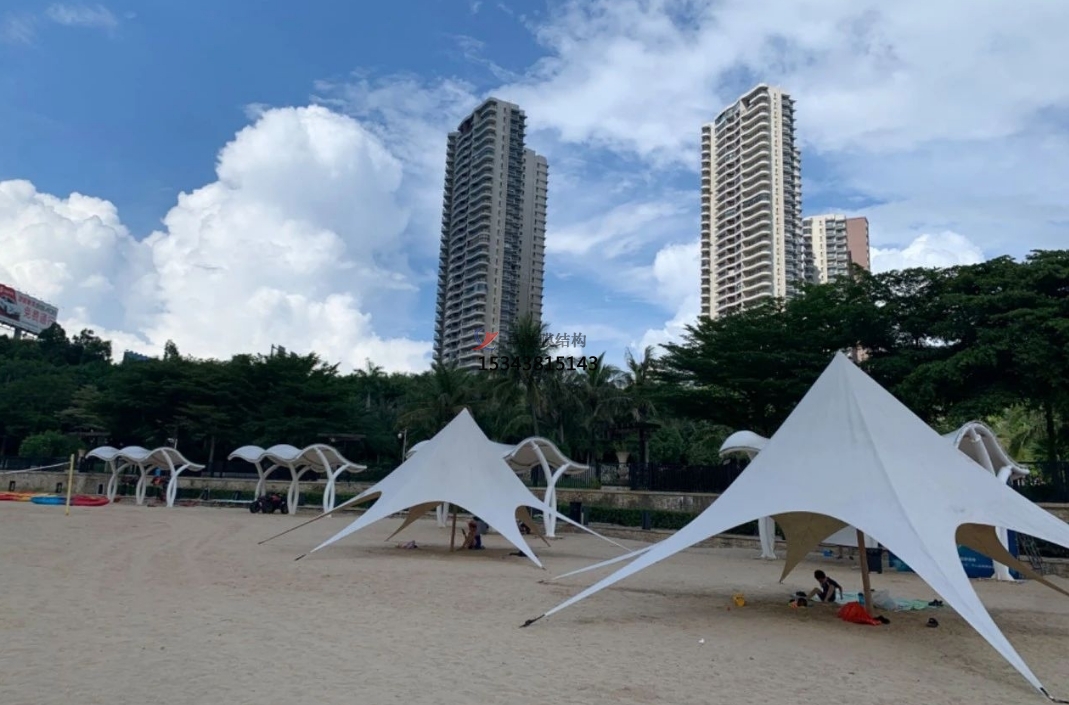 景觀棚膜結(jié)構(gòu)最大的特點之一就是其幾乎不受限制的造型能力。設(shè)計師可以根據(jù)不同的場地需求、文化背景以及功能要求,創(chuàng)造出如貝殼般優(yōu)雅的曲線、如帆船般靈動的輪廓、如花朵般綻放的形態(tài)等等。這種獨特的造型不僅能夠成為視覺上的焦點,提升整個區(qū)域的景觀品質(zhì),還能很好地與周圍的自然環(huán)境或建筑風(fēng)格相融合,形成和諧統(tǒng)一的整體畫面。