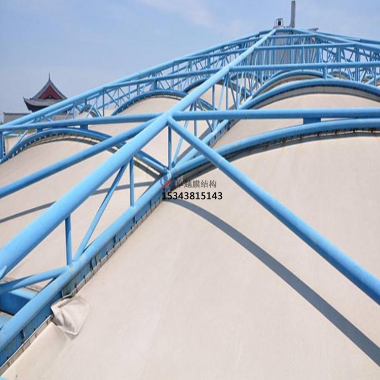 鋼架反吊膜結(jié)構(gòu)是專門用于污水池加蓋密閉的一種膜結(jié)構(gòu)形式,結(jié)構(gòu)形式新穎,防腐耐霉,由鋼結(jié)構(gòu)、膜結(jié)構(gòu)及安裝輔件構(gòu)成,根據(jù)不同污水池現(xiàn)場條件進(jìn)行個性化設(shè)計安裝。鋼結(jié)構(gòu)在外部形成穩(wěn)定受力結(jié)構(gòu),膜材料反吊與機(jī)構(gòu)內(nèi),隔絕廢氣對剛架構(gòu)的腐蝕。鋼架反吊膜分為圓形反吊膜和方形反吊膜,其中方形反吊膜又分為拱形及吊帽結(jié)構(gòu)。