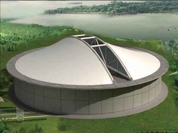 污水池加蓋膜結(jié)構(gòu)材質(zhì)說明:一般可分為張拉式膜結(jié)構(gòu)及骨架支承式膜結(jié)構(gòu)二種,它們具有不同的結(jié)構(gòu)特點(diǎn)、建筑表現(xiàn)形式,適應(yīng)不同的應(yīng)用場所。鋼支承反吊膜結(jié)構(gòu)是專門針對污水池加蓋開發(fā)的新型結(jié)構(gòu)方式,選用了耐腐蝕的膜材料作為覆蓋材,并通過反吊的形式來適應(yīng)污水池的腐蝕性環(huán)境。