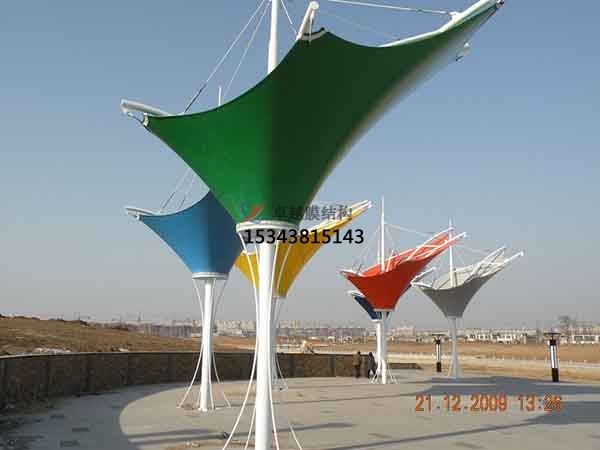 一個城市的中心區(qū)反映一個城市的地理風貌和民族風情,同時,也是一個城市文化發(fā)展程度的標志。而景觀設(shè)計要求其具有廣泛的可讀性、雅俗共賞,既有超凡脫俗的藝術(shù)價值,又能使大眾喜聞樂見與大眾息息相通。膜結(jié)構(gòu)以其輕盈飄逸的造型、柔美并帶有力量的曲線和大跨度和大空間的鮮明個性和標識性,應用于城市小品設(shè)計中。
