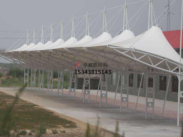 車棚是一種古老的建筑形式,自有史以來就被用來作為房屋和簡易的遮蔽物。如今隨著建筑技術,計算機技術和新材料研究的飛速發(fā)展,性能優(yōu)良的新型膜材被用于建造永久性的車棚結構,即膜結構車棚,這種結構的車棚一般由索和膜材這些柔性材料張拉而成。